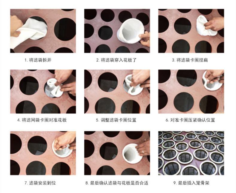 3、把新的布袋安放進花板孔內,再把骨架放入除塵塵布袋內卡住。